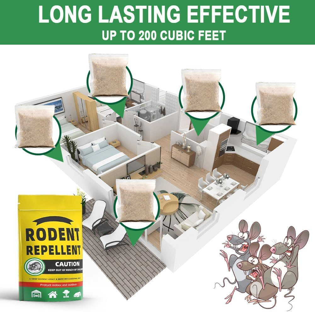 Experience a pest-free home with our powerful rodent repellent sachets. Designed to be long-lasting and effective, each sachet covers up to 200 cubic feet, ensuring comprehensive protection against mice and rats. Just place these discreet sachets around your house and enjoy an environment safe from unwanted rodents. Ideal for use in kitchens, basements, garages, and more. Available in a neutral color and compact size, these sachets blend seamlessly into any setting.