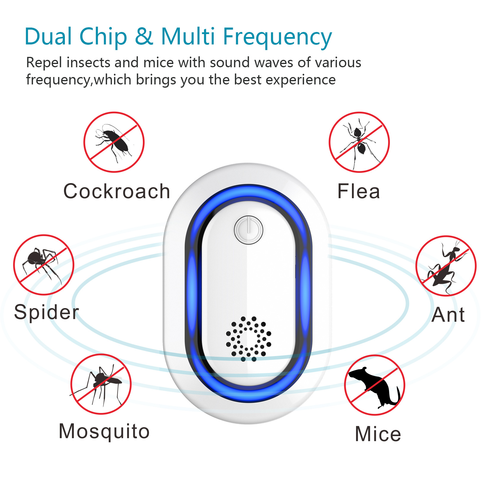 Experience a revolutionary way to keep your home pest-free with our Ultrasonic Pest Repeller. Featuring an elegant white housing and modern blue LED lights, this device is designed to blend seamlessly with any decor. The strategically placed vents ensure the ultrasonic waves are distributed effectively, providing superior pest control. Perfect for any room in your home, this compact and discreet repeller works tirelessly to keep unwanted pests at bay. Enhance your living space with a solution that's both aesthetically pleasing and highly functional.